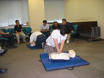最初に応急手当の必要性をビデオで学習し、その後実際に人工呼吸、心臓マッサージといった心肺蘇生法やAED(自動体外式除細動器)の使用法を消防署員の方々の指導を受けながら、受講者各々が実践しました。
